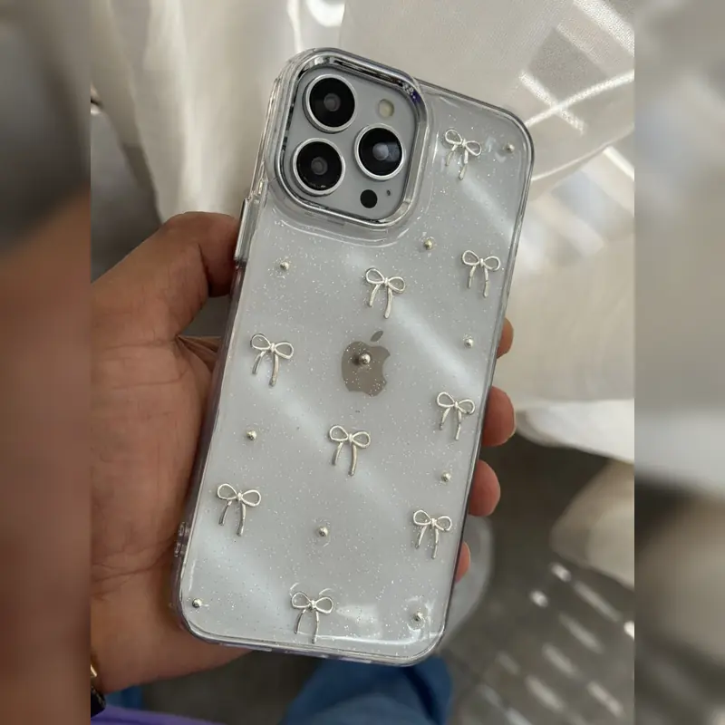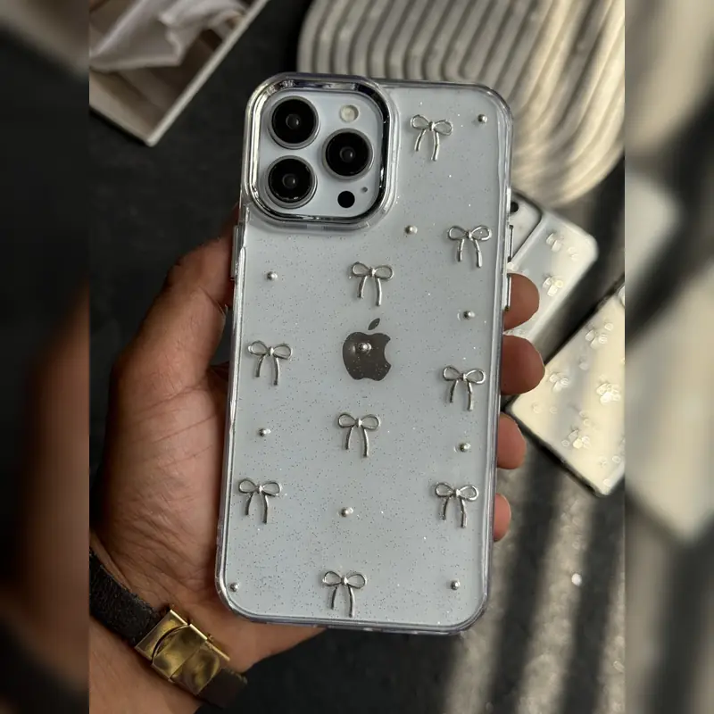 ویژگیهای کلیدی قاب ژلهای شفاف اکلیلی طرح پاپیون فلزی Transparent Bow Glitter Case برای iPhone 16 Pro Max: